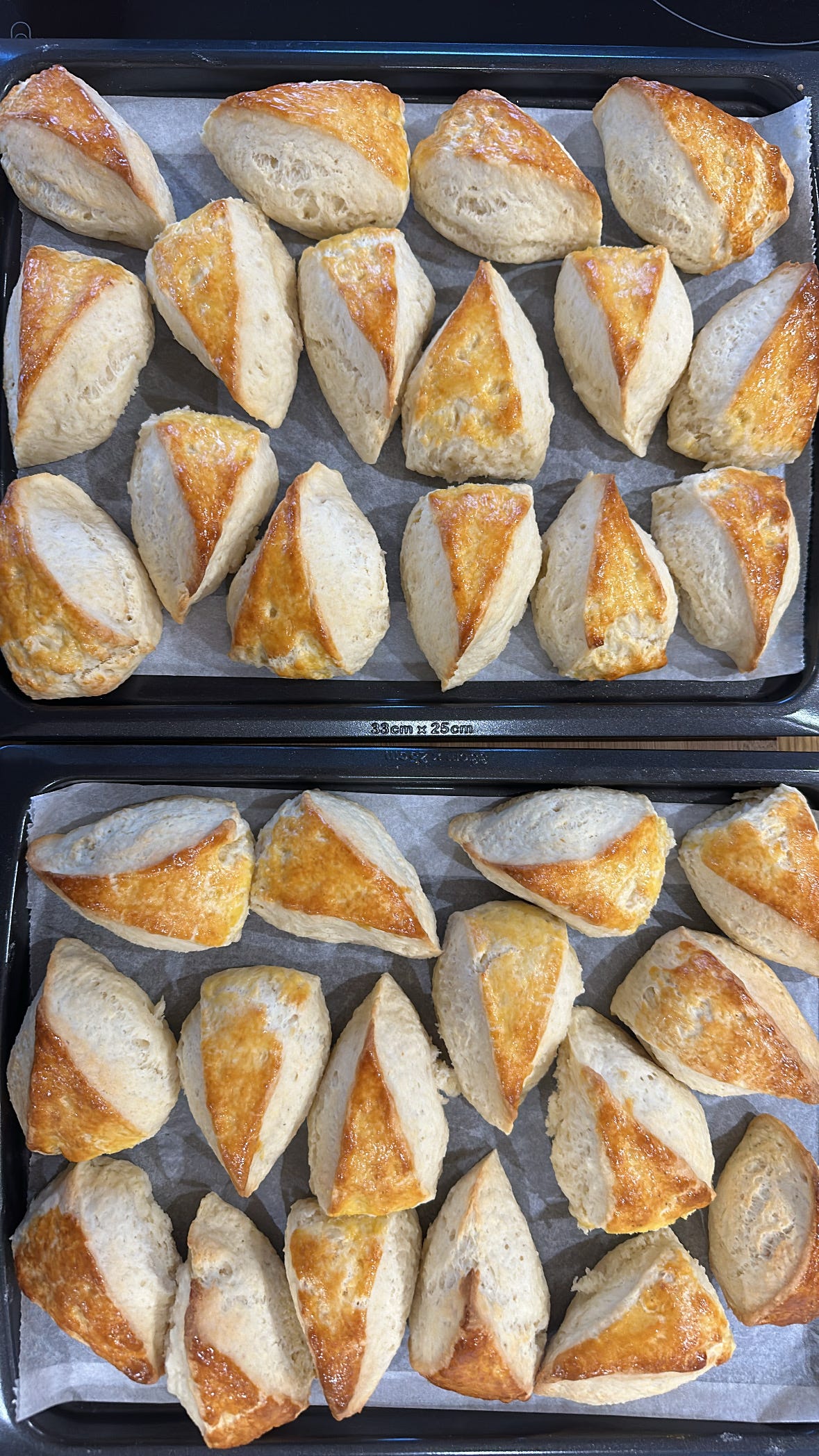 But only recently, when baking a double batch for the cast and crew of the pantomime I have been performing in at the Alhambra Theatre in Bradford, did I come up with the time saving decision to cut the dough into triangles rather than discs. I usually do that with more American-style scones (pumpkin spice and blueberry glazed), which I make absolutely gigantic. But wanting to eke the dough out for the brilliant theatre team, I decided this time to make them into miniature triangles, similar in size to a dainty morsel you’d get on an afternoon tea.